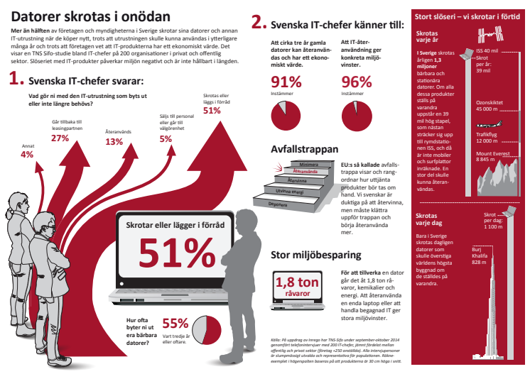 Svenska företag och myndigheter skrotar sina datorer och mobiler när de köper nytt, trots att produkterna skulle kunna återanvändas i många år. En TNS Sifo-studie som Inrego låtit göra bland IT-chefer på 200 företag och myndigheter visar att hälften av organisationerna, 51 procent, rutinmässigt skrotar eller magasinerar utrustning som hade kunnat komma till användning igen.