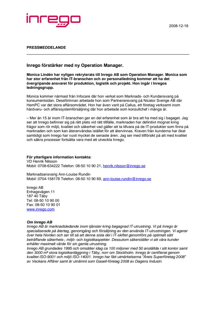 Monica Lindén har nyligen rekryterats till Inrego AB som Operation Manager. Monica som har stor erfarenhet från IT-branschen och av personalledning kommer att ha det övergripande ansvaret för produktion, logistik och projekt. Hon ingår i Inregos ledningsgrupp.