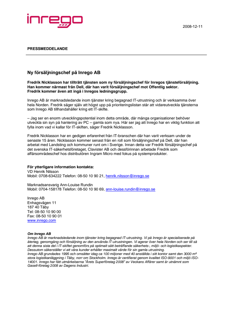 Fredrik Nicklasson har tillträtt tjänsten som ny försäljningschef för Inregos tjänsteförsäljning. Han kommer närmast från Dell, där han varit försäljningschef mot Offentlig sektor. Fredrik kommer även att ingå i Inregos ledningsgrupp.
